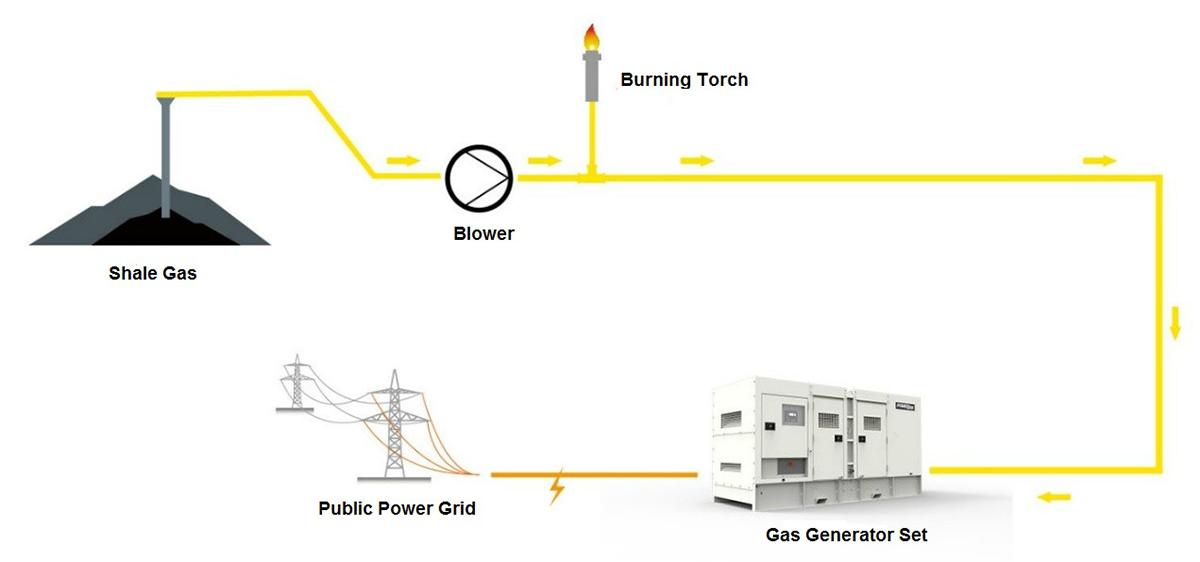 由于頁巖氣甲烷濃度較高,因此可以按天然氣發(fā)電機(jī)組標(biāo)準(zhǔn)進(jìn)行發(fā)電利用。頁巖氣發(fā)電利用如下圖示例。